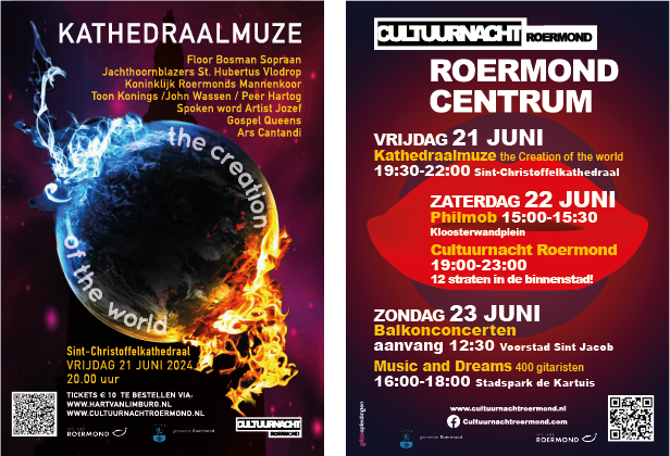 Graag maken wij jullie attent op alle muzikale activiteiten in het weekend van 21, 22 en 23 juni in Roermond. Alle informatie en hoe je kaarten kunt bestellen, vind je op https://cultuurnachtroermond.nl