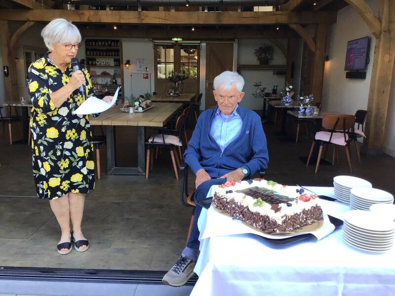 Hij was onze weldoener, sponsor, mecenas, techneut en is vooral een aimabel mens. Pierre was zeer verrast en nadat hij een bijzondere taart met daarop een foto van Con Amore had aangesneden werd er gezellig bij gepraat.
